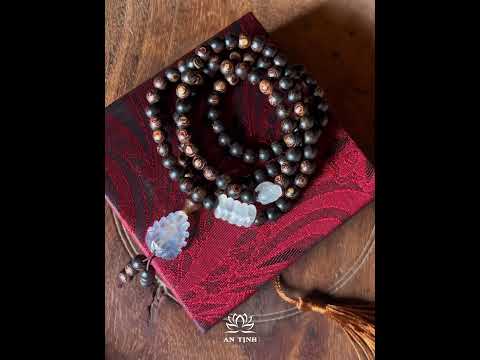 Chuỗi vòng 108 hạt được chế tác từ Trầm sánh – loại trầm hương nhân tạo được ép từ bột trầm và tinh dầu, có vân bóng đẹp, tỏa hương thơm dịu nhẹ, lưu hương lâu, giúp thu hút năng lượng tích cực và mang lại cảm giác an yên.